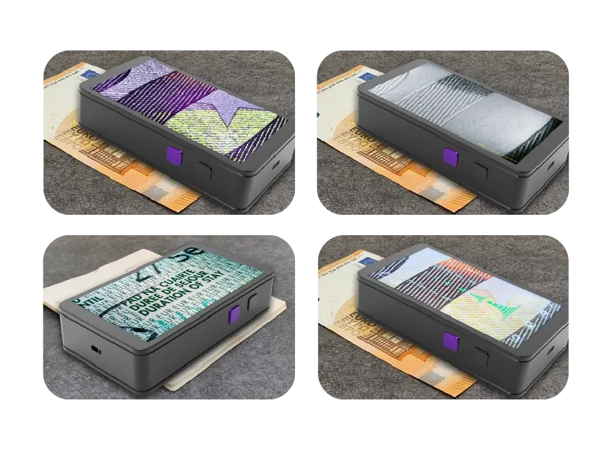 The Spectra Pocket is a high-definition document examination device which can be used for a wide range of applications. The Spectra Pocket can be used to examine security documents, banknotes, textiles, coins, etc. It captures and saves images and videos on the internal TF card and supports live video output to an external monitor through the USB Type-C port.
